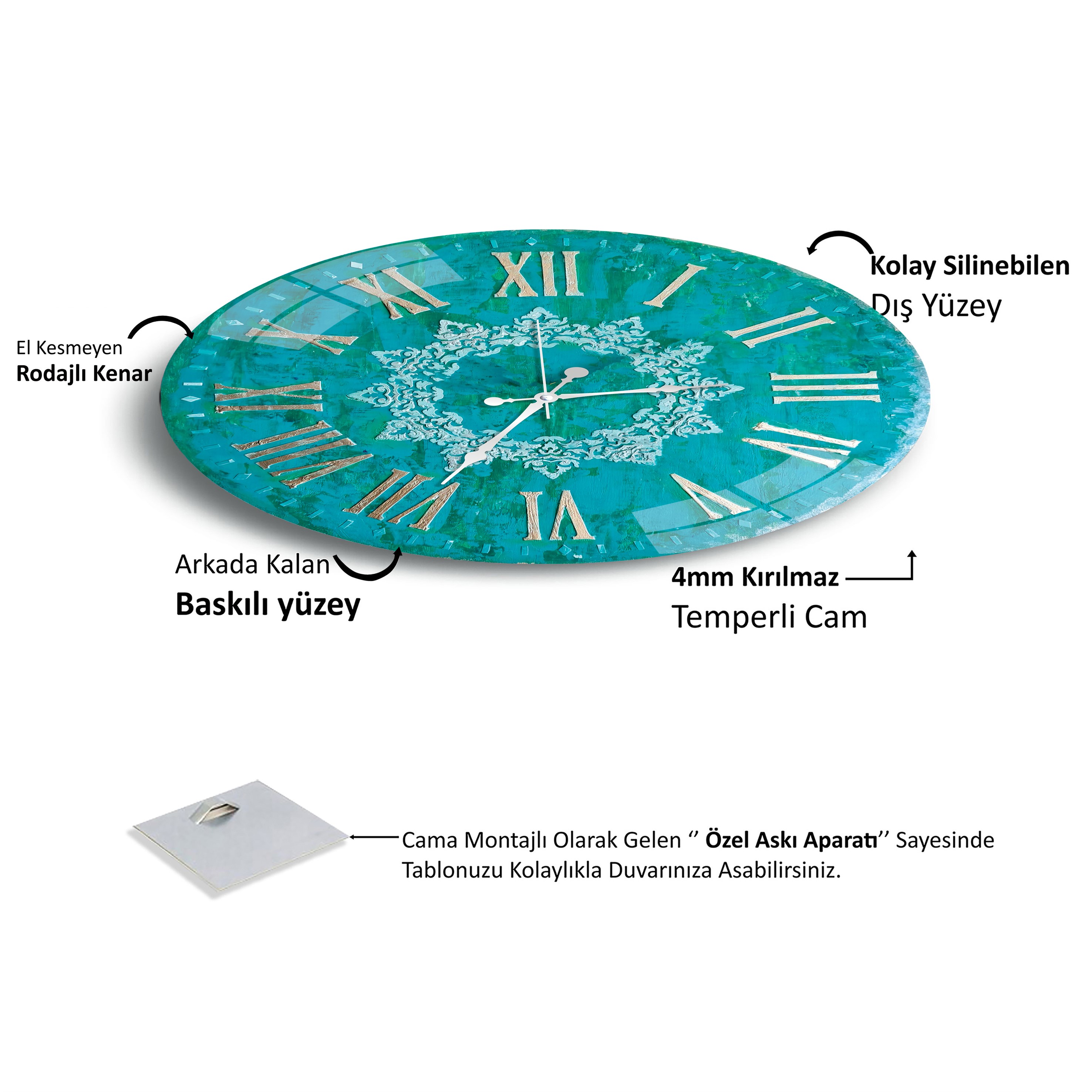 Doğrudan camın arka yüzenine uv baskı tekniğiyle yüksek çözünürlüklü makinelerle üretilmektedir.